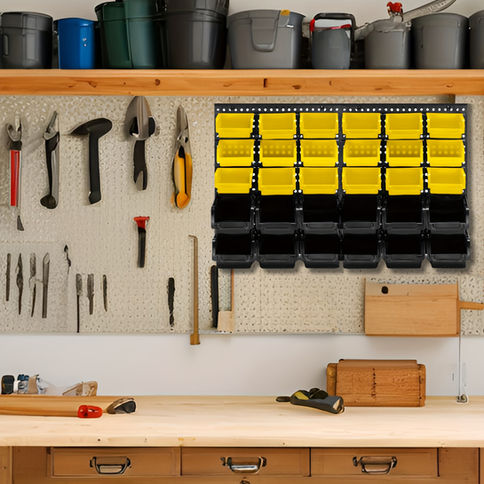 Das 30-teilige Wandregalsystem von HomeFlowMaster ist die perfekte Lösung für alle, die Ordnung, Übersicht und Platzersparnis in ihrer Werkstatt oder Garage suchen. Mit 12 großen schwarzen Boxen und 18 kleineren gelben Boxen bietet dieses Set maximalen Stauraum für Schrauben, Nägel, Werkzeuge, Ersatzteile, Kabel oder Bastelmaterialien.